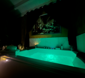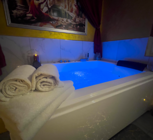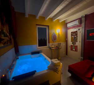 Al centro della stanza troverai una maestosa vascaidromassaggio per due persone, impreziosita da luci soffuse e connessione Bluetooth, per avvolgerti in un'atmosfera di puro relax e armonia.